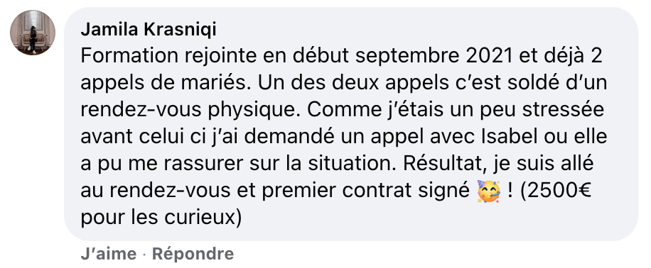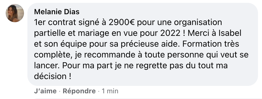 J'ouvre 20 places avec une rĂ©duction de 50% pour ma formation qui va t'apprendre Ă ĂȘtre Wedding Planner et a obtenir des clients facilement